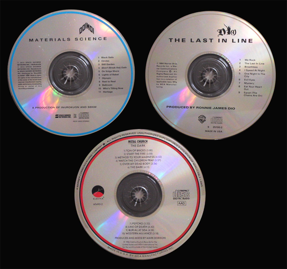 ※写真左上:DOIMOI「MATERIALS SCIENCE」 / 写真右上:DIO「HOLY DIVER」(WARNER盤) / 写真下:METAL CHURCH「THE DARK」(ELEKTRA)