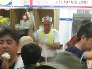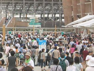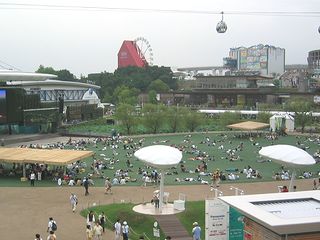 ▼一生のうちにまた日本でやることもないだろうし、せっかく近くでやってるし…と一念発起して赴いたのではありません。姉夫婦がウチ一家を招いてくれたんですな。ということで5人での移動。朝9時頃駐車場着、駐車料金は一般車が3000円/日。そこからシャトルバスで会場に運ばれます。バスは本数も多くて変に待たされることはないのですが、補助席まで出して満員になるまで詰められます。そこらへんを不快に思う向きは藤ヶ丘からのリニアモーターカーを利用すべきでしょう。会場到着、ゲートにて荷物検査&金属探知機。に至るまでにまず、標準的な中学校の体育館にすし詰めで7〜8杯分くらいの人間が列(というより絨毯、芝生の域)をなす。しかし断続的ながら数百人単位でドッドッと通されているようで、覚悟したほどは待たずに済みます。荷物検査は、何千人もの列をバイト君が日々さばいてるわけですから、当然かなり適当です。神妙な面持ちで中を覗き込まれて「ふんふんふん、ハイいいですよ」みたいに言われるのだがカバンの開いてないポケットに持ち込みのペットボトルや火炎瓶やブートレッグ収録グッズがあっても絶対バレない。