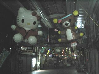 |  ↑各家庭がこのようなハリボテを作り、自宅前のアーケード天井にゾロゾロと吊るします これは力作の部類 高校の学祭みたい