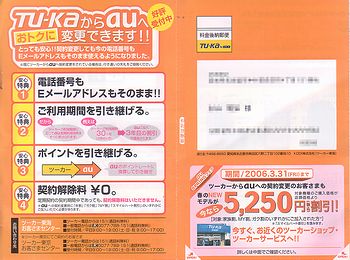 TU-KAユーザであることをいっそ逆ステイタスにしてやろうと決め込み、他社に乗り換えず使い続けてもう7年目になるみたいです。しかし今回はこの割引の話に加えてauの「MY割」までいきなり適用され基本使用料が45.5%OFFからスタートとのことでさすがに揺らぎ、しかもこのハガキ、今月一杯が締め切りのくせに届いたのが先週末くらい。2週間足らずの短い猶予で焦らせてやろうという魂胆が見え見えなわけですが、コッチもトントンとそれに乗っかって、明日私はauに宗旨替えしてこようと思っています。TU-KAの同志の皆さん、さようなら、すいません、ありがとう。骨伝導スピーカー全然使えなかったよ。もっと早くにTU-KAを見捨ててJ-PHONE(現VODAFONE)とかに乗り換えたという人は今頃、ソフトバンクに買収されて「『ヤフーフォン』になったらどうしよう…」と狼狽してることでしょう、ヒヒヒ。