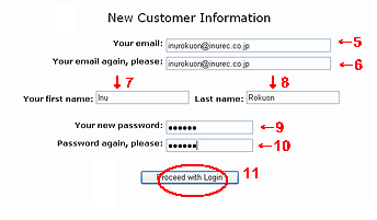▼基本情報を設定します。 5:メールアドレスを入力。 6:確認のためもう一度メールアドレス。 7:下の名前を記入します。 8:こっちは名字を。 9:パスワードを適当に決めて打ち込みます。 10:上で打ったのと同じパスワードをもう一度。 11:先へ進みます。