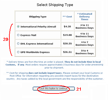 ▼次は輸送方法を選びます。日本でいえば「冊子小包か、クロネコメール便か」てな場面です。 20:値段と所要日数の兼ね合いで納得のいく選択肢をここから選びます。ちなみに私は「4〜11日」のものが4日で届いたことがあります。 21:先へ進みます。