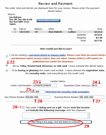 ▼次は送り先情報および選択された輸送方法でかかる料金の総計の確認と、ちょっと緊張の走る決済方法の選択・設定です。ここではクレジットカードを使う方法でいきます。 22:VISA、MasterCard、Discover、JCBカードのいずれかをお持ちの方はまずここが選択されていることを確認して下さい。 23:16桁のカード番号を、ハイフンは入れずに打ち込みます。 24:お手持ちのカードの期限を記入します。カードのオモテ面に書かれているとおりに打って下さい。 25:3桁の「セキュリティ・コード」を入れる欄。お手持ちのカードの裏面の署名欄のふちに何桁かの番号が書かれていますので、その下3桁だけを打ち込みます。 26:昼間に連絡のつく電話番号を書き入れます。 27:同じく夜用の電話番号。使われることは滅多にないでしょうから、日本って何番だっけ…とかは気にせず市外局番から打ってしまえばOKでしょう。 28:ギフト用途でメッセージを添えたいといったことがなければ、このチェックボックスおよび下のフォームは無視。 29:先へ進みます。