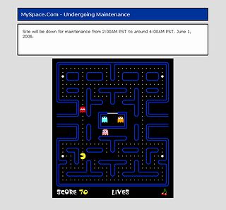 ▼MYSPACEにアクセスしたら「サーバメンテのため2時間くらいダウンしてます。」というお知らせ画面に、復旧までのヒマ潰し用にFLASH版パックマンが添えられてて笑いました。ついでに楽しんでしまいました。いやードキドキした。すぐ死んだけど。