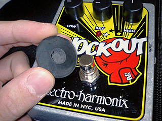 なるべくジャストサイズで、そして深くまっすぐにくり抜くのがポイントです。これによって踏むときの表面積が増えるとともに、多少アングルが甘くてもOKになるため、踏み損ない率が抜群に低下、しかも底の薄い靴でも(なんなら裸足でも)痛くない。無論音質への影響もゼロ。おカタい機械スイッチを丸く収めるこの「フミソコナワーズ」、絶対飛ぶように売れますよ、PICKBOYさんやキクタニさんよ。その際は正直に「貴殿の日記を拝見し製品化に至りました。つきましてはアイディア料として…」というメールをくれ。